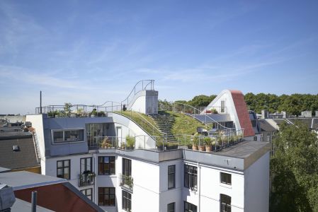 Ud over de tre nye penthouselejligheder giver den smukke tagterrasse plads til et trædæk til ophold, en gummibelagt overflade til fysiske udfoldelser samt en ”græsbølge” i to niveauer med trapper til at sidde på, et brusebad og et udekøkken. Der er mange fine detaljer, bl.a. er der fra de fleste rum i boligerne udgang til en privat terrasse med udsigt til det tætte København mod øst og vest. Desuden har den nye terrasse betydet energibesparelser for ejendommen.