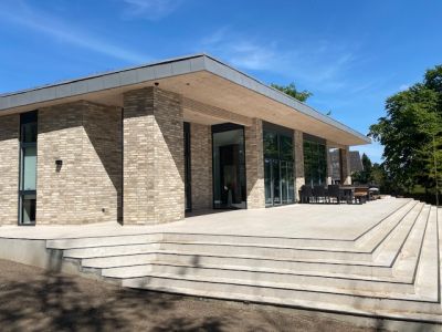 Som et græsk tempel er dette enfamiliehus højt indlejret i landskabet med udsigt over Roskilde Fjord. Set fra fjorden synes det næsten at ”kysse himlen”. På den anden side af vandet ses landskabet af jævne morænebakker fra seneste istid. Grunden lander ved fjordens bred, og fra bredden bugter en sti sig levende gennem græsset og op til villaen. Grunden er 5.516 m2, hvor selve haven falder i to tempi.